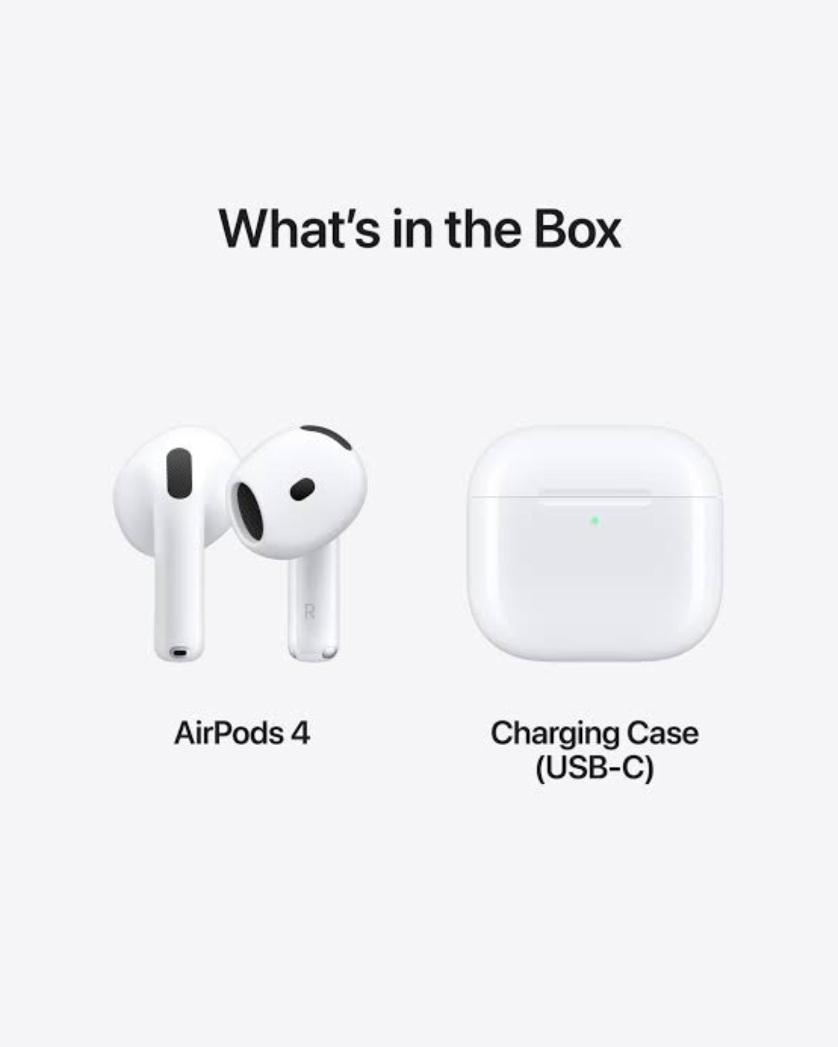 • In the box: AirPods 4 with ANC, USB-C charging case, documentation (USB-C cable sold separately).