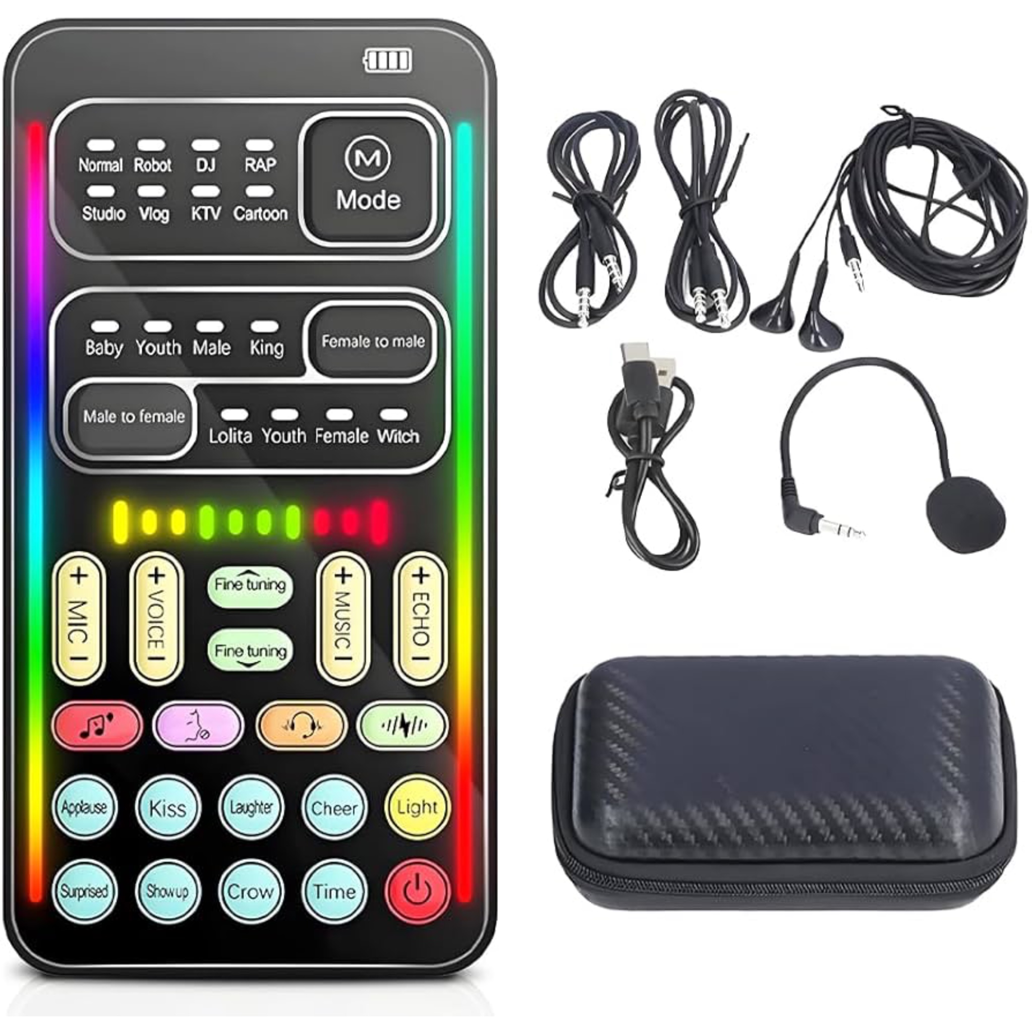Equipped with 16 electronic tones and 8 built-in sound effects, it allows you to add fun and creativity to your streams. The voice changer feature lets you switch between different voice modes (male, female, child, etc.), making it great for entertainment and gaming.