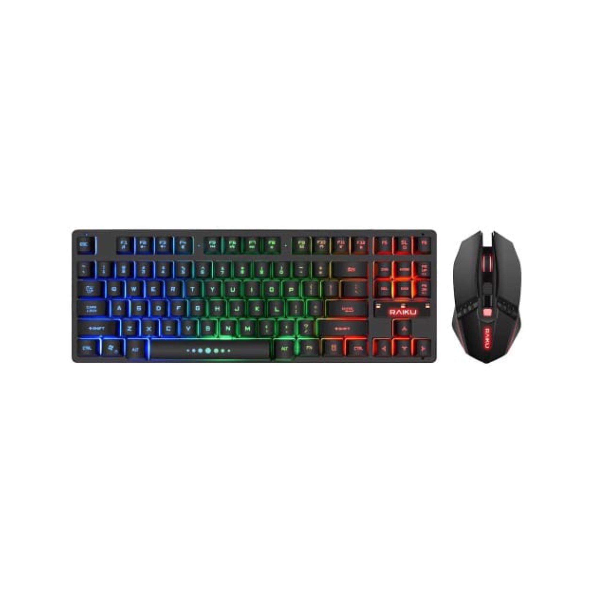 The Raiku R905 is a budget-friendly wireless gaming keyboard and mouse combo designed for both gaming and everyday productivity. It features a compact 87-key (tenkeyless/TKL-style) keyboard paired with an ergonomic mouse, sharing a single 2.4GHz USB receiver for easy setup and minimal USB port usage. It’s popular as an affordable entry-level option with RGB lighting, rechargeable batteries, and silent operation.